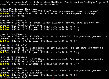 Get-CsPersistentChatRoom -PersistentChatPoolFqdn "lyncse02.ucmart.co.uk" |Remove-CsPersistentChatRoom