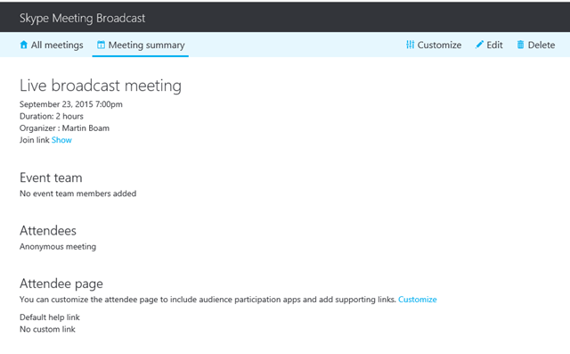 - You cannot currently create a custom URL with Skype Meeting Broadcast. If your organization requires a shorter, more friendly URL, please use a popular URL shortening tool such as tinyurl.com or bit.ly. This will also allow you to change the meeting URL without needing to send a new invitation to your attendees if you have to recreate your meeting.