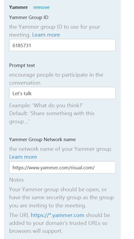 The following parameters would be used to include Yammer while customizing your broadcast event.