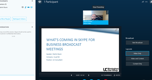 In August i presented a session at the UC Birmingham User Group on Broadcast meetings and did a live demo. Link to the slides can be found here