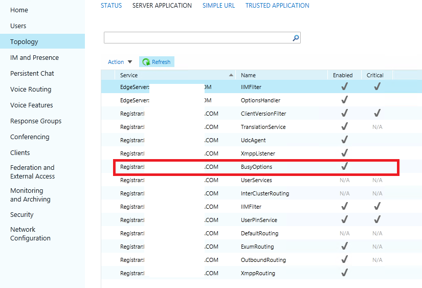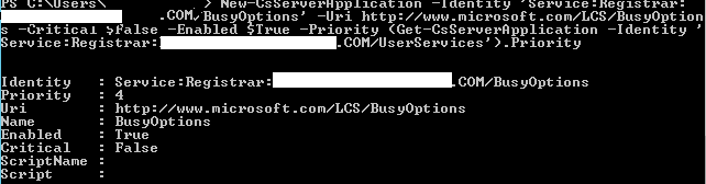New-CsServerApplication -Identity ‘Service:Registrar:lyncse01.ucmart.co.uk/BusyOptions’ -Uri http://www.microsoft.com/LCS/BusyOptions -Critical $False -Enabled $True -Priority (Get-CsServerApplication -Identity ‘Service:Registrar:lyncse01.ucmart.co.uk/UserServices’).Priority
