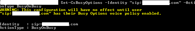 Set-CsBusyOptions –identity “Display Name” – ActionType BusyOnBusy