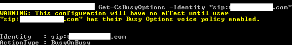 Notice a warning in this case the user selected voice policy did not have Busy Options enabled which is a good reminder!