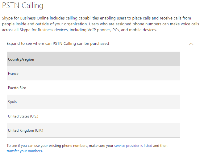 From Microsoft’s Countries and regions that are supported for Skype for Business Online PSTN Services web page here