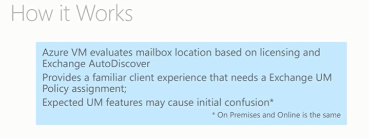 KEY POINT – Azure relies on Exchange UM only for client side features to work and be visible. NO UM engine is leveraged for used.