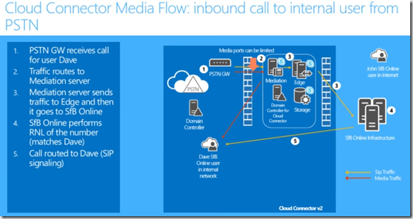 Inbound call comes into the PSTN GW and into the mediation server then to the edge server then to SfB Online and then SfB online looksup the number and finds this is Dave and send an invite and can answer the call.