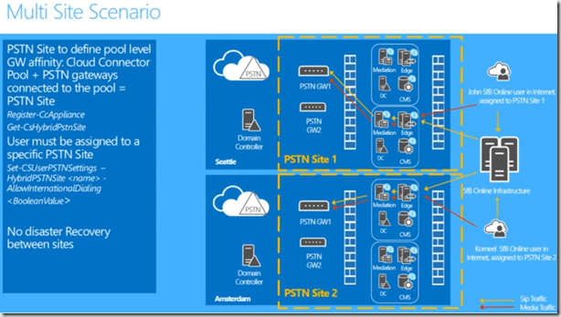 There is NO DR between sites. In the event Amsterdam (PSTN Site2) goes offline there’s no automatic failover so calls go out the US (PSTN Site1). This is manual DR but considerations for inbound calls are required.