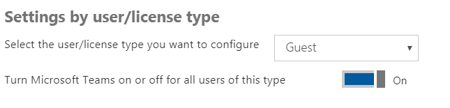 Toggle “Turn Microsoft Teams on or off for all users of this type” to ON