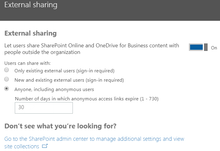 - Note that external sharing is turned on by default for your entire SharePoint Online environment and the site collections in it.