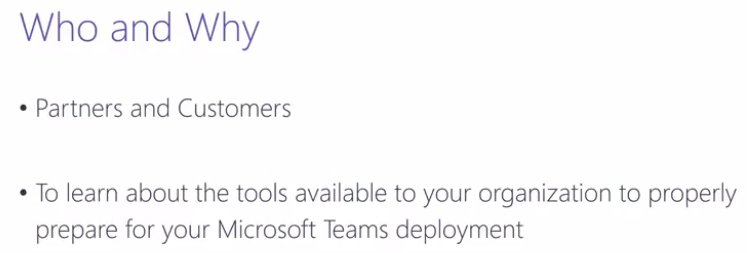 Training is for Partners and customers and anyone that wants to learn about the tools available to prepare for your Teams deployment.