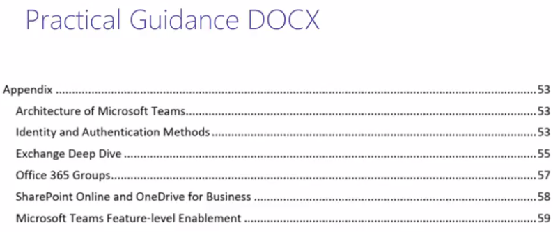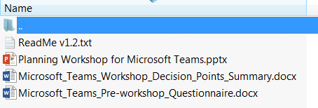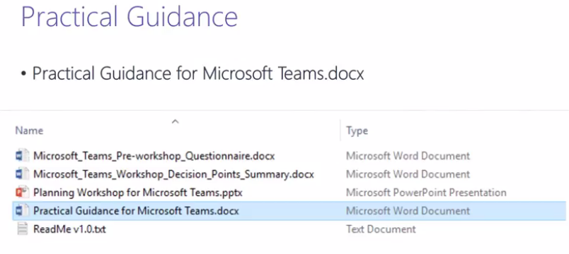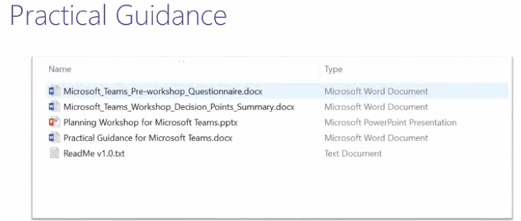The Microsoft Teams Practical Guide and Planning Workshop Kit are comprised of 4 assets. (Says 4 assets but only three listed below, perhaps this needs updating as there was 4 before it seems in README v1 listed on session)