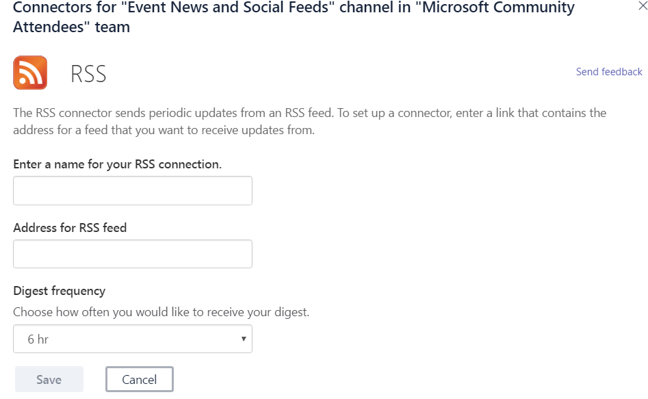 In RSS enter a name for your RSS connection, Address for RSS and select Digest Frequency from drop down and click save.