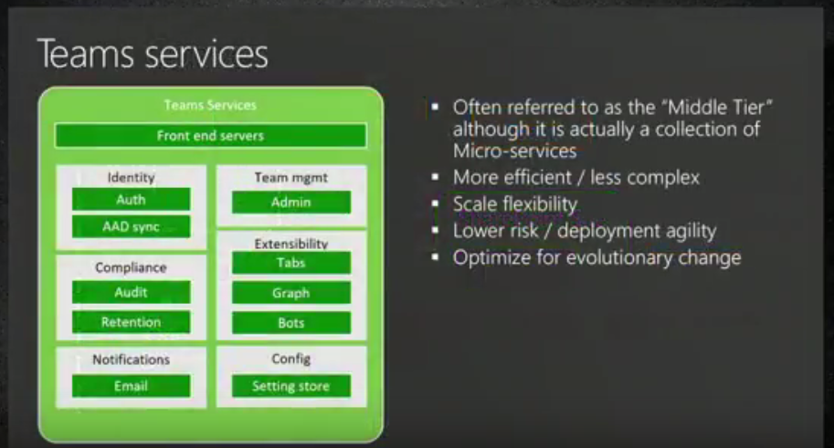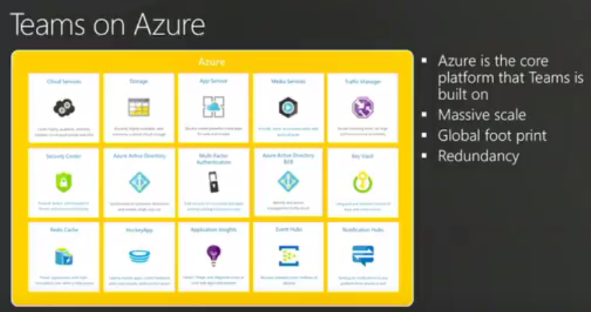 - Teams talks to different parts of Microsoft, store data in Azure and user key vault, azure storages, Azure AD, caches in a lot of places, Azure allows global footprint quickly,