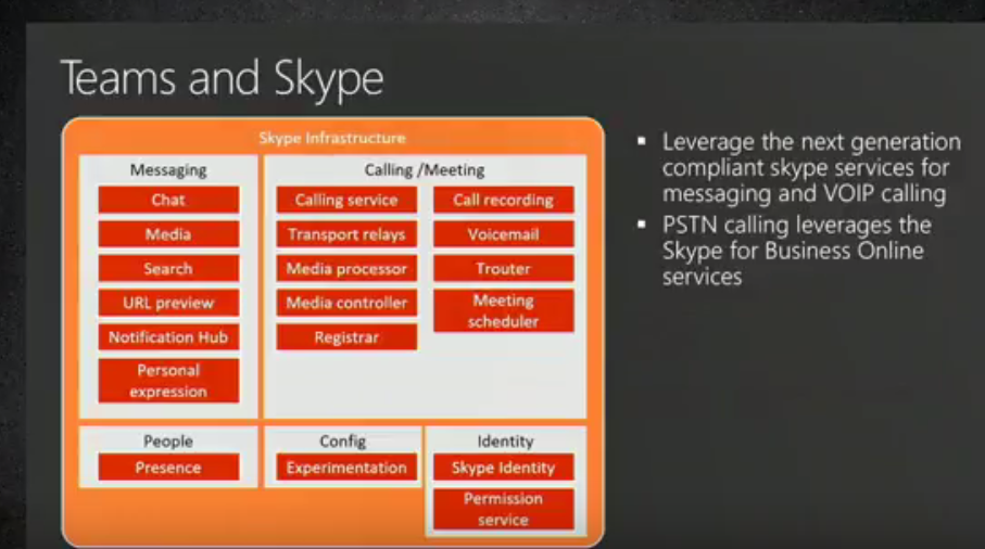 - A lot of chat from modern Skype side, Chat , media , search, powerful search in Teams, URL preview service, notification hub and on calling and meeting side some are in common with Skype for Business and some modern Skype stack, all set of teams working together.