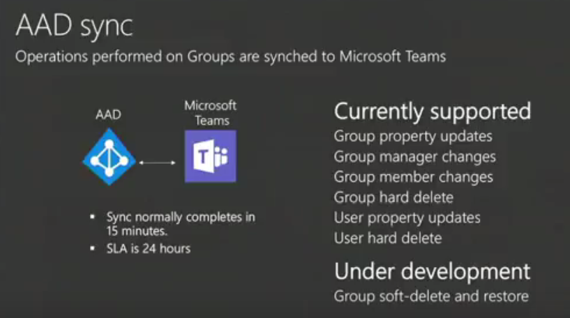 - Microsoft Teams backed by Groups and users AD groups as well, add more member in Teams UI and move in AAD and sync to Teams. Sync averages 15 minutes but SLA is 24 hours