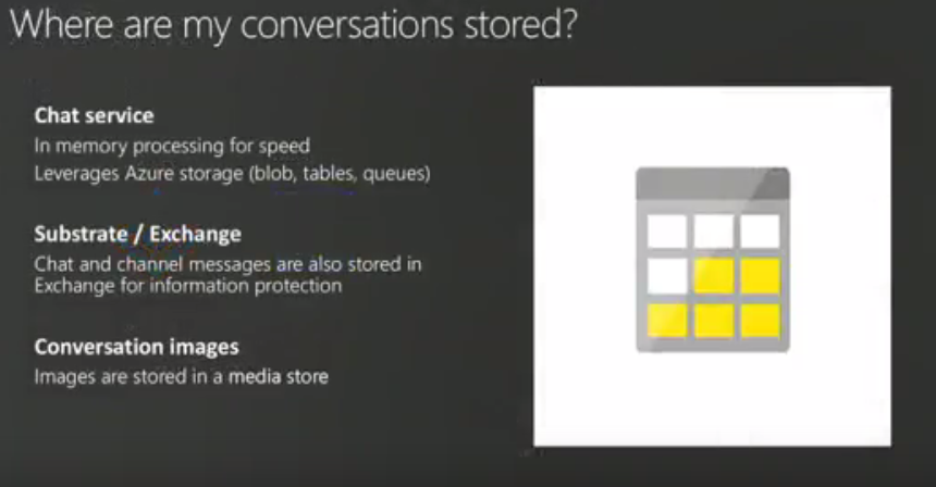 - Chat service behind teams, more processing happens in memory, backed by Azure storage down to Exchange, Images in separate media store.