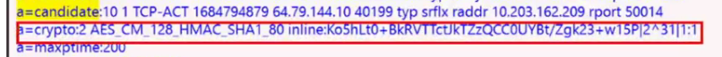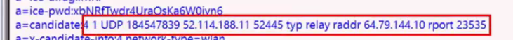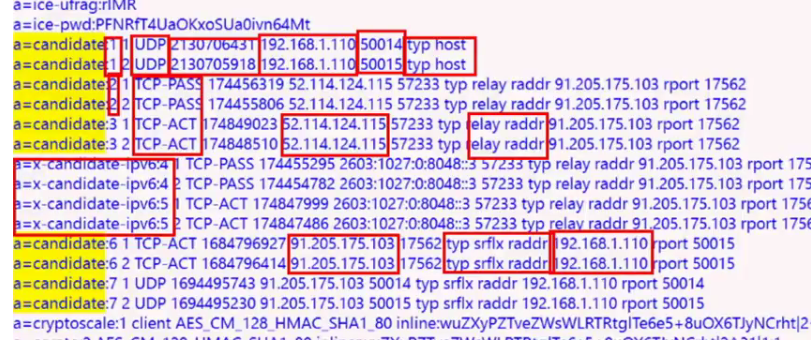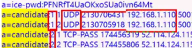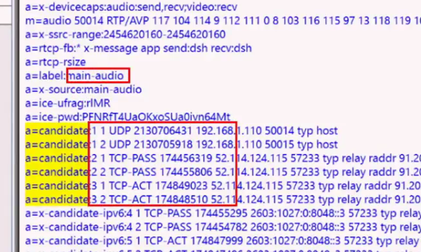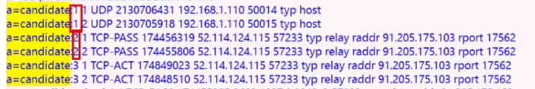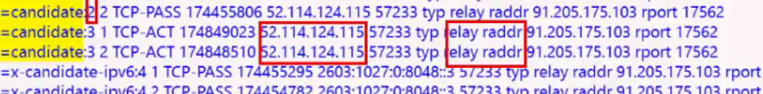 Both connect to relay allocated candidates port 433 TCP or 3478 UDP, for udp it will then be redirected on workload 3479 for audio