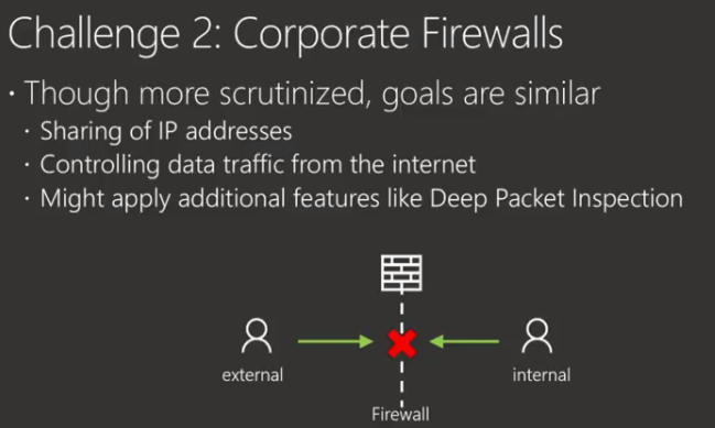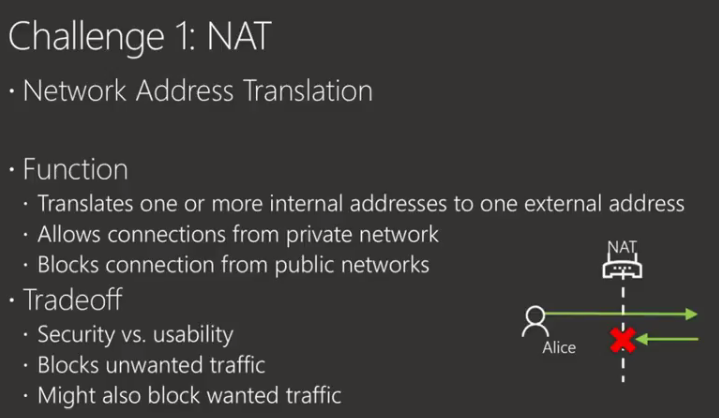 Firewalls also may not allows direct communication from external clients on internet to internal clients. Charlie to Alice