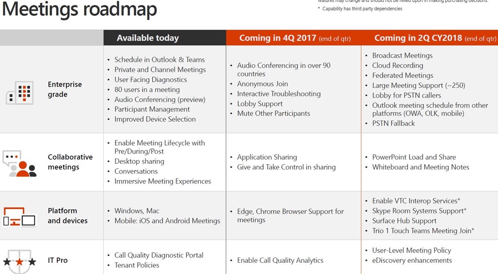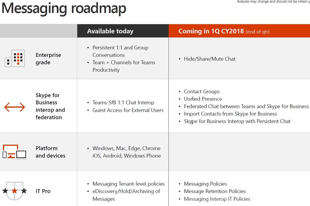I noticed thanks to Mark Vale the Teams roadmap was released detailing the roadmap for Microsoft Teams for messaging, meetings and calling. This is eagerly waiting after the news from Ignite that Microsoft Teams will replace Skype for Business Online and this Roadmap gives us a vision into the roadmap and when Teams may have what you need to move over. The recommendation from Microsoft is try Teams now.