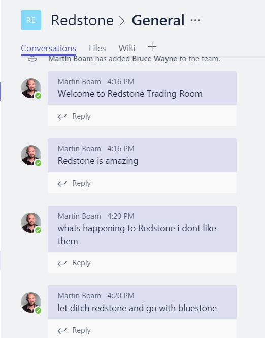 In teams i created a new Teams called redstone and said a few words