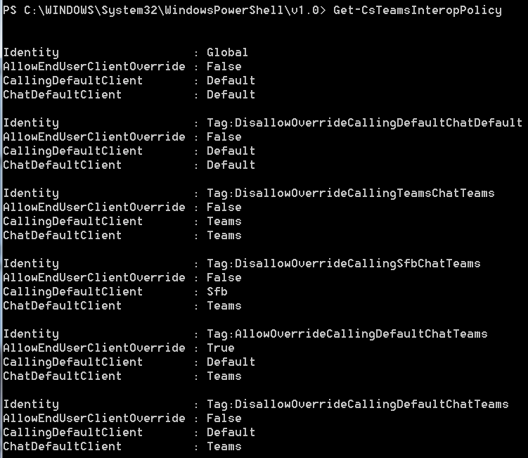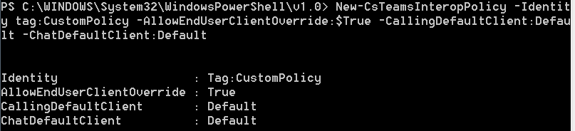 New-CsTeamsInteropPolicy -Identity tag:CustomPolicy -AllowEndUserClientOverride:$True -CallingDefaultClient:Default -ChatDefaultClient:Default