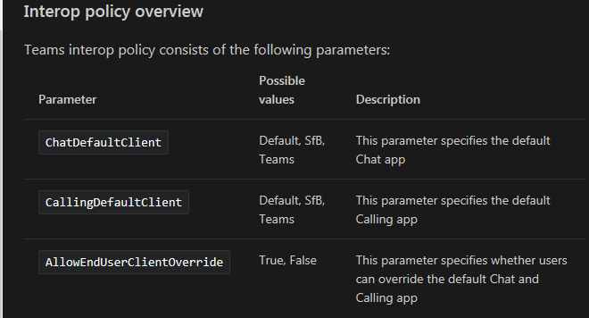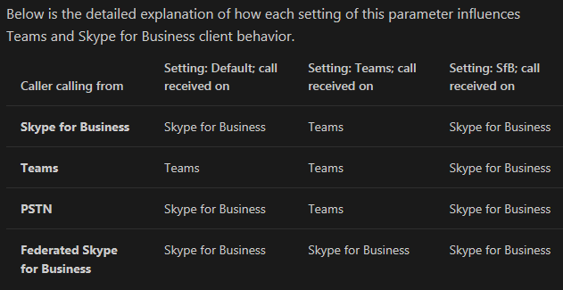 • The CallingDefaultClient parameter defines how calls are routed between Teams and Skype for Business, and the default global value of this parameter is set to Default.