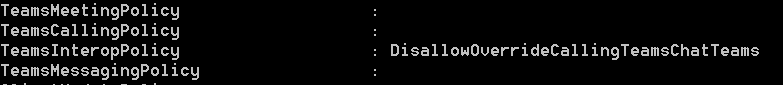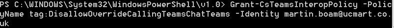 Grant-CsTeamsInteropPolicy -PolicyName tag:DisallowOverrideCallingTeamsChatTeams -Identity martin.boam@ucmart.co.uk