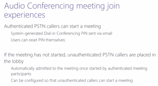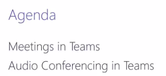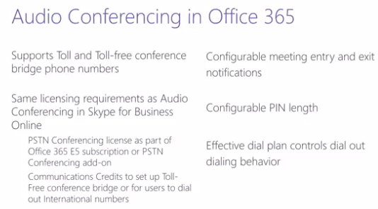 First up is the introduction to Audio Conferencing in Teams, if you were familiar with PSTN Conferencing with Skype for Business Online its the same thing but the name has been change to Audio Conferencing. Also in the video it refers to Audio Conferencing as dial in conferencing as well which is the same.