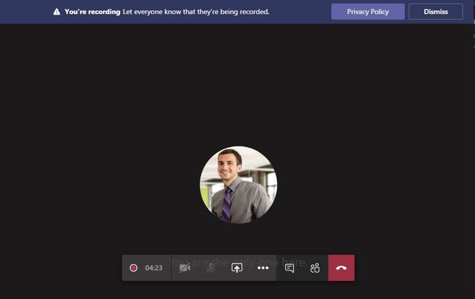 With Teams recording enabled when a user starts recording in a meeting the purple banner appears at the top highlighting to everyone the recording is in progress and has started for this meeting.