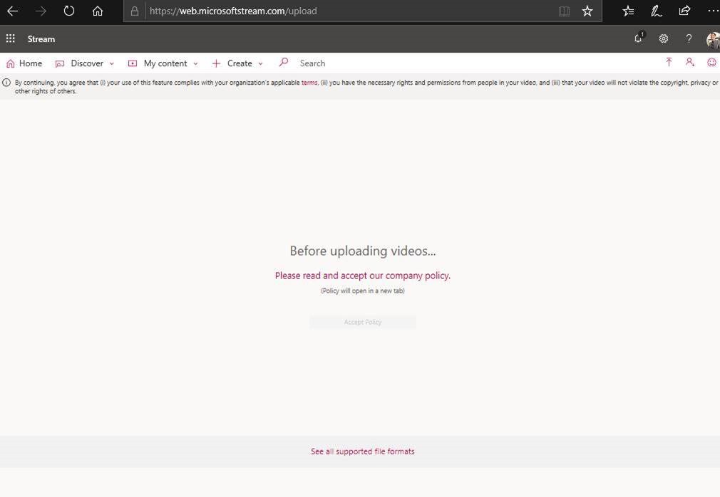Here i tried to upload a video to stream when i had not accepted the policy and you can see i cant do this until i read and accept the company policy in Stream.