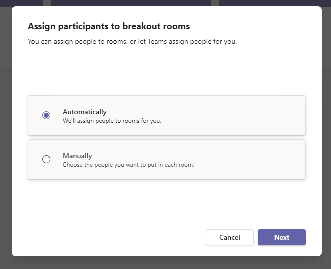 Please note – If you have selected to manually assign participants then you will need to assign everyone to their rooms you can manual add some then automatically assign some. If you want to move back to automatically assign participants instead of manual you will need to assign all users and start again or remove the rooms and create new ones. Then the next time you go back to assign participants the automatically assign will display again. This time lets choose automatically.