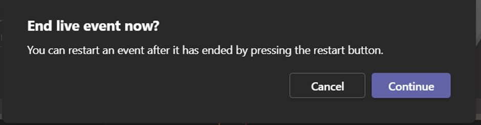 From looking it seems you can restart an event thats live and also end an event and then restart it again. The restarting a live event seems to mean the attendees wont see an event has ended message and have to re join again whereas ending an event and then restarting it show a message then the event has ended and required attendees rejoin with the same link. Perhaps restarting an event thats live is best from an attendee point of view so be careful of this. In both case restarting an event warns that any recording, transcripts is lost and producers and presenters are forced to rejoin.