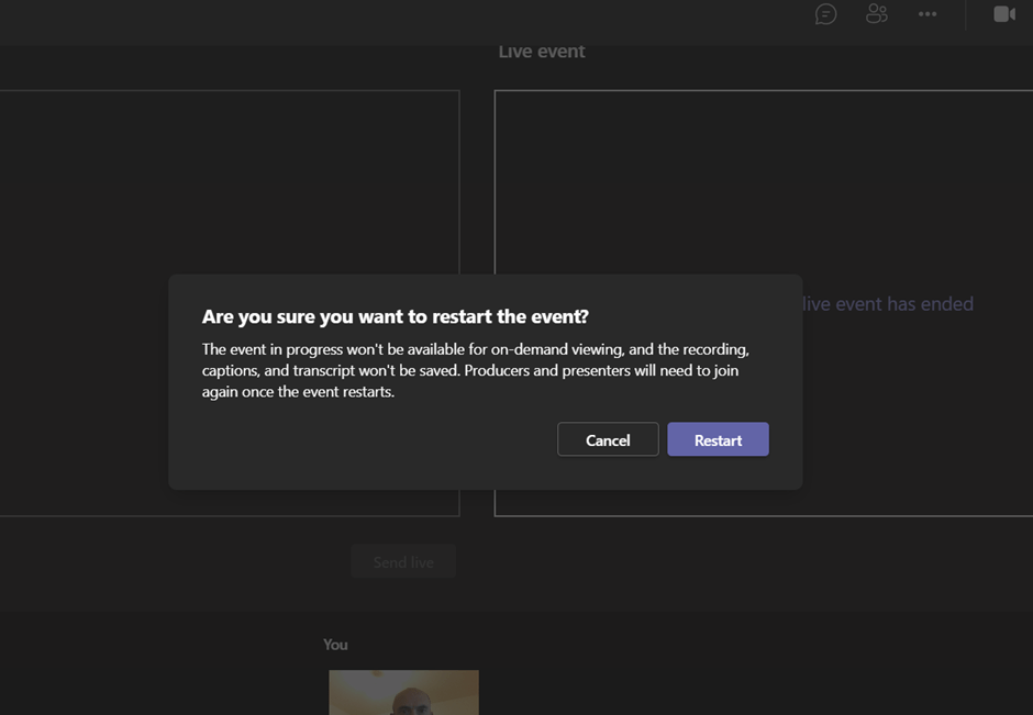 So restarting the end will mean that any on demand, recording, captions or transcripts that had taken place wont be saved and producers and presenters will need to join again.