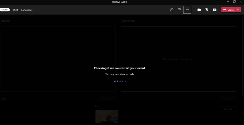 Teams will then verify that the event can be restarted. If Teams can successfully restart your live event, the producers and presenters will be disconnected, while attendees watching the event will see a waiting screen informing them that the event will begin shortly. Producers and presenters will need to rejoin and start the event again.