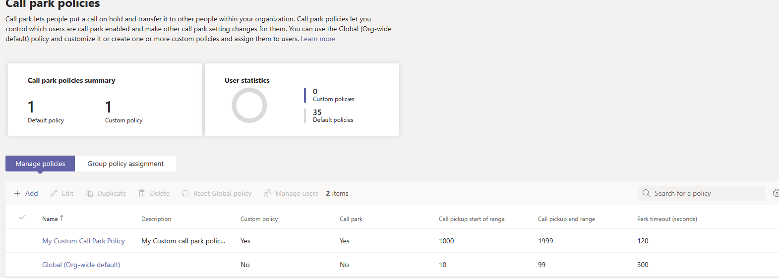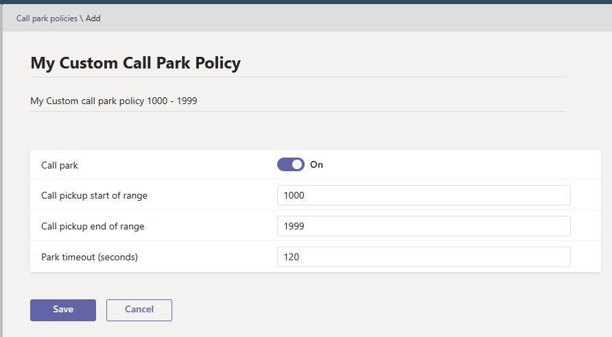 New-CsTeamsCallParkPolicy -Identity “My Custom Call Park Policy” -AllowCallPark $true -PickupRangeStart 1000 -PickupRangeEnd 1999 -ParkTimeoutSeconds 120