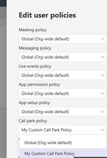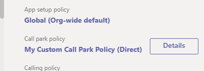 Grant-CsTeamsCallParkPolicy -PolicyName ‘My Custom Call Park Policy‘ -Identity “Adele Vance”
