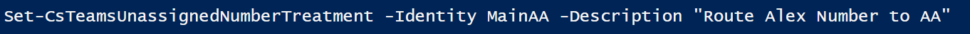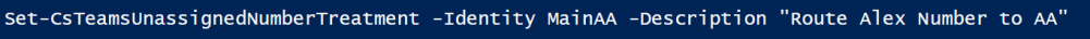 Set-CsTeamsUnassignedNumberTreatment -Identity MainAA -Description “Route Alex Number to AA”