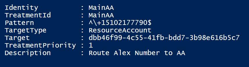 New-CsTeamsUnassignedNumberTreatment -Identity MainAA -Pattern “^+15102177790$” -TargetType ResourceAccount -Target $RAObjectId -TreatmentPriority 1
