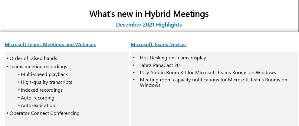 Here’s is a video recap of what’s new in Microsoft Teams Hybrid Meetings for December2021, this is a monthly recap on what’s been announced and coming soon to Microsoft Teams Hybrid Meetings from the Microsoft Team Blog, M365 Blog and M365 roadmap.