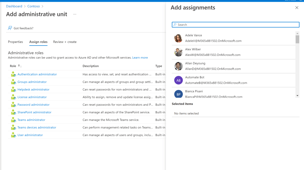 So here i get the option to add administartive roles to the administrative unit im going to select Teams devices administrator