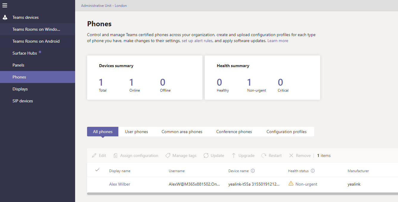 If we go to Teams Admin centre as Adele we should see the Yealink phone that Alex Wilber is using and only be able to manage devices lets look