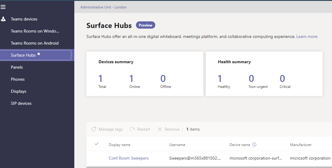 I also added a room account for a Surface Hub and here you go, only that hub appeared for London Administrator unit.